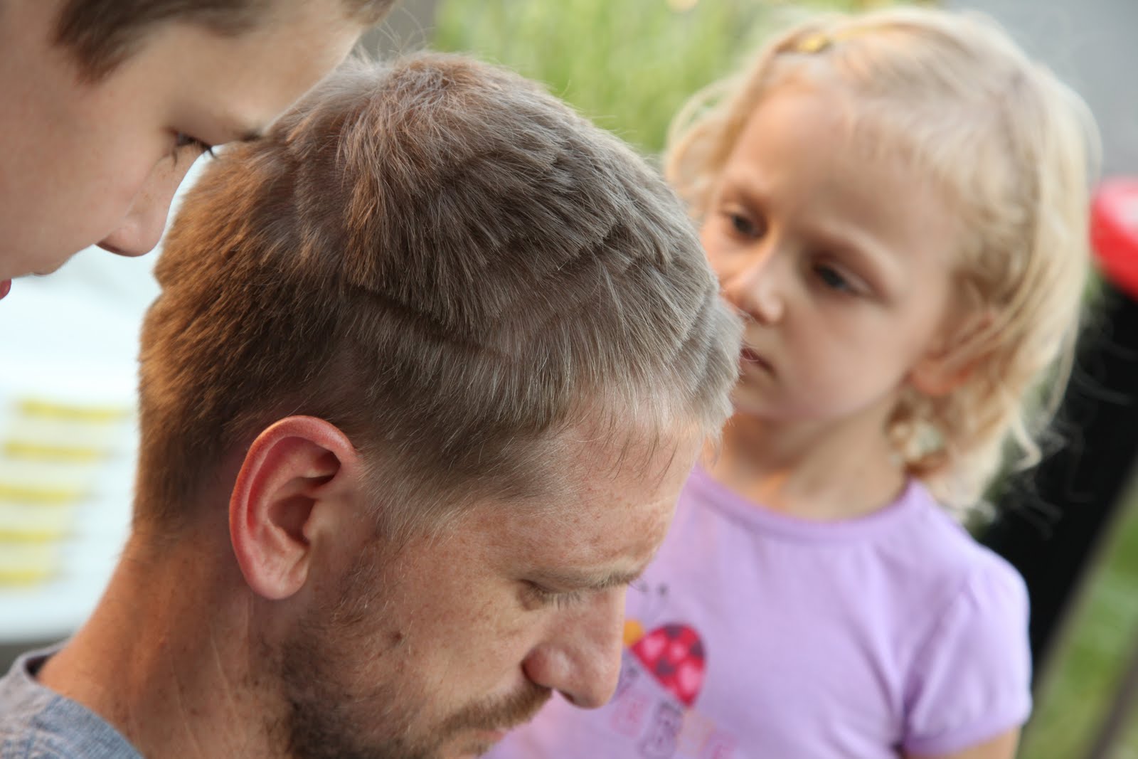 J decided that he wanted to do something to make Big Sis's 5th birthday extra memorable. So he invested in some clippers and shears and gave her free reign of his head for a real live barber shop experience. It turned out to be quite the event!